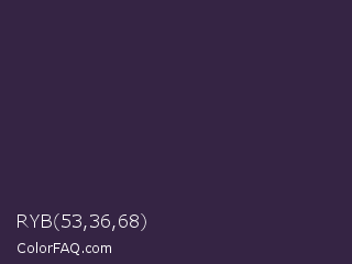 RYB 53,36,68 Color is a very dark purple color and the nearest color is Blackcurrant #32293a. Hex code #352444 and RGB value is rgb(53,36,68). In RGB color space, this color is composed of 21% red, 14% green, 27% blue, In CMYK color space, this color is composed of 22% cyan, 47% magenta, 0% yellow , 73% black , In HSL color space, this color has a hue angle of 272° , 31% saturation and 20% lightness.