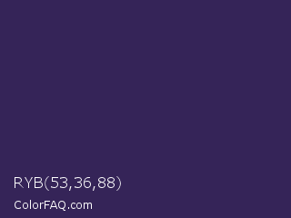 RYB 53,36,88 Color is a dark indigo color and the nearest color is Deep Grape #381a51. Hex code #352458 and RGB value is rgb(53,36,88). In RGB color space, this color is composed of 21% red, 14% green, 35% blue, In CMYK color space, this color is composed of 40% cyan, 59% magenta, 0% yellow , 65% black , In HSL color space, this color has a hue angle of 260° , 42% saturation and 24% lightness.