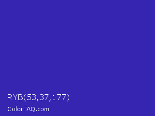 RYB 53,37,177 Color is a normal indigo color and the nearest color is Governor Bay #2f3cb3. Hex code #3525b1 and RGB value is rgb(53,37,177). In RGB color space, this color is composed of 21% red, 15% green, 69% blue, In CMYK color space, this color is composed of 70% cyan, 79% magenta, 0% yellow , 31% black , In HSL color space, this color has a hue angle of 247° , 65% saturation and 42% lightness.