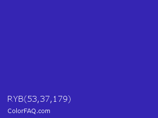RYB 53,37,179 Color is a normal indigo color and the nearest color is Governor Bay #2f3cb3. Hex code #3525b3 and RGB value is rgb(53,37,179). In RGB color space, this color is composed of 21% red, 15% green, 70% blue, In CMYK color space, this color is composed of 70% cyan, 79% magenta, 0% yellow , 30% black , In HSL color space, this color has a hue angle of 247° , 66% saturation and 42% lightness.