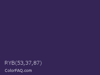 RYB 53,37,87 Color is a dark indigo color and the nearest color is Deep Grape #381a51. Hex code #352557 and RGB value is rgb(53,37,87). In RGB color space, this color is composed of 21% red, 15% green, 34% blue, In CMYK color space, this color is composed of 39% cyan, 57% magenta, 0% yellow , 66% black , In HSL color space, this color has a hue angle of 259° , 40% saturation and 24% lightness.