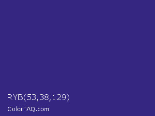 RYB 53,38,129 Color is a normal indigo color and the nearest color is Cosmic Cobalt #2e2d88. Hex code #352681 and RGB value is rgb(53,38,129). In RGB color space, this color is composed of 21% red, 15% green, 51% blue, In CMYK color space, this color is composed of 59% cyan, 71% magenta, 0% yellow , 49% black , In HSL color space, this color has a hue angle of 250° , 54% saturation and 33% lightness.