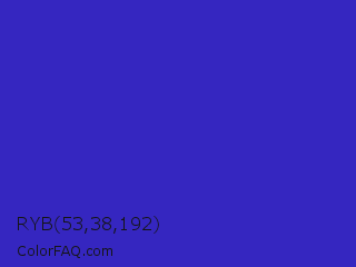 RYB 53,38,192 Color is a normal indigo color and the nearest color is Governor Bay #2f3cb3. Hex code #3526c0 and RGB value is rgb(53,38,192). In RGB color space, this color is composed of 21% red, 15% green, 75% blue, In CMYK color space, this color is composed of 72% cyan, 80% magenta, 0% yellow , 25% black , In HSL color space, this color has a hue angle of 246° , 67% saturation and 45% lightness.