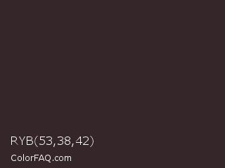 RYB 53,38,42 Color is a very dark rose color and the nearest color is Thunder #33292f. Hex code #35262a and RGB value is rgb(53,38,42). In RGB color space, this color is composed of 21% red, 15% green, 16% blue, In CMYK color space, this color is composed of 0% cyan, 28% magenta, 21% yellow , 79% black , In HSL color space, this color has a hue angle of 344° , 16% saturation and 18% lightness.