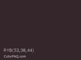 RYB 53,38,44 Color is a very dark rose color and the nearest color is Thunder #33292f. Hex code #35262c and RGB value is rgb(53,38,44). In RGB color space, this color is composed of 21% red, 15% green, 17% blue, In CMYK color space, this color is composed of 0% cyan, 28% magenta, 17% yellow , 79% black , In HSL color space, this color has a hue angle of 336° , 16% saturation and 18% lightness.