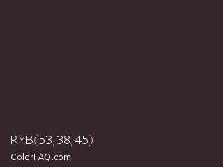 RYB 53,38,45 Color is a very dark rose color and the nearest color is Thunder #33292f. Hex code #35262d and RGB value is rgb(53,38,45). In RGB color space, this color is composed of 21% red, 15% green, 18% blue, In CMYK color space, this color is composed of 0% cyan, 28% magenta, 15% yellow , 79% black , In HSL color space, this color has a hue angle of 332° , 16% saturation and 18% lightness.