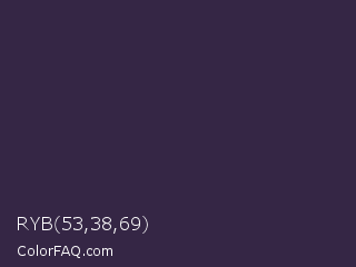 RYB 53,38,69 Color is a very dark violet color and the nearest color is Blackcurrant #32293a. Hex code #352645 and RGB value is rgb(53,38,69). In RGB color space, this color is composed of 21% red, 15% green, 27% blue, In CMYK color space, this color is composed of 23% cyan, 45% magenta, 0% yellow , 73% black , In HSL color space, this color has a hue angle of 269° , 29% saturation and 21% lightness.