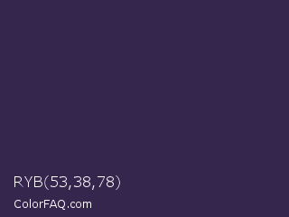 RYB 53,38,78 Color is a dark violet color and the nearest color is Martinique #363050. Hex code #35264e and RGB value is rgb(53,38,78). In RGB color space, this color is composed of 21% red, 15% green, 31% blue, In CMYK color space, this color is composed of 32% cyan, 51% magenta, 0% yellow , 69% black , In HSL color space, this color has a hue angle of 263° , 34% saturation and 23% lightness.