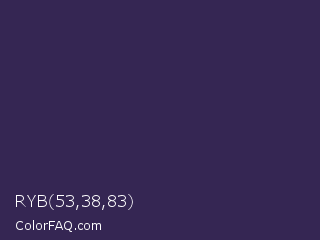 RYB 53,38,83 Color is a dark indigo color and the nearest color is Martinique #363050. Hex code #352653 and RGB value is rgb(53,38,83). In RGB color space, this color is composed of 21% red, 15% green, 33% blue, In CMYK color space, this color is composed of 36% cyan, 54% magenta, 0% yellow , 67% black , In HSL color space, this color has a hue angle of 260° , 37% saturation and 24% lightness.