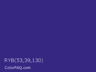 RYB 53,39,130 Color is a normal indigo color and the nearest color is Cosmic Cobalt #2e2d88. Hex code #352782 and RGB value is rgb(53,39,130). In RGB color space, this color is composed of 21% red, 15% green, 51% blue, In CMYK color space, this color is composed of 59% cyan, 70% magenta, 0% yellow , 49% black , In HSL color space, this color has a hue angle of 249° , 54% saturation and 33% lightness.