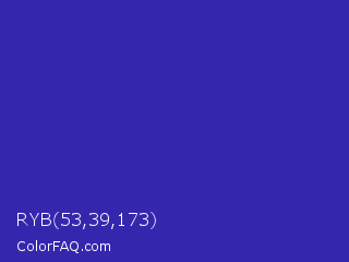RYB 53,39,173 Color is a normal indigo color and the nearest color is Governor Bay #2f3cb3. Hex code #3527ad and RGB value is rgb(53,39,173). In RGB color space, this color is composed of 21% red, 15% green, 68% blue, In CMYK color space, this color is composed of 69% cyan, 77% magenta, 0% yellow , 32% black , In HSL color space, this color has a hue angle of 246° , 63% saturation and 42% lightness.