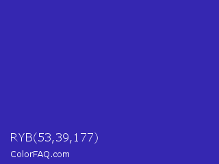 RYB 53,39,177 Color is a normal indigo color and the nearest color is Governor Bay #2f3cb3. Hex code #3527b1 and RGB value is rgb(53,39,177). In RGB color space, this color is composed of 21% red, 15% green, 69% blue, In CMYK color space, this color is composed of 70% cyan, 78% magenta, 0% yellow , 31% black , In HSL color space, this color has a hue angle of 246° , 64% saturation and 42% lightness.