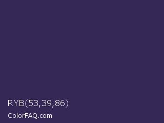 RYB 53,39,86 Color is a dark indigo color and the nearest color is Martinique #363050. Hex code #352756 and RGB value is rgb(53,39,86). In RGB color space, this color is composed of 21% red, 15% green, 34% blue, In CMYK color space, this color is composed of 38% cyan, 55% magenta, 0% yellow , 66% black , In HSL color space, this color has a hue angle of 258° , 38% saturation and 25% lightness.