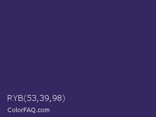 RYB 53,39,98 Color is a dark indigo color and the nearest color is Jacarta #3a2a6a. Hex code #352762 and RGB value is rgb(53,39,98). In RGB color space, this color is composed of 21% red, 15% green, 38% blue, In CMYK color space, this color is composed of 46% cyan, 60% magenta, 0% yellow , 62% black , In HSL color space, this color has a hue angle of 254° , 43% saturation and 27% lightness.
