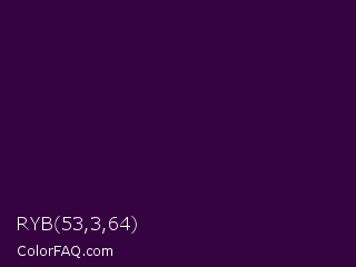 RYB 53,3,64 Color is a very dark purple color and the nearest color is Mardi Gras #350036. Hex code #350340 and RGB value is rgb(53,3,64). In RGB color space, this color is composed of 21% red, 1% green, 25% blue, In CMYK color space, this color is composed of 17% cyan, 95% magenta, 0% yellow , 75% black , In HSL color space, this color has a hue angle of 289° , 91% saturation and 13% lightness.