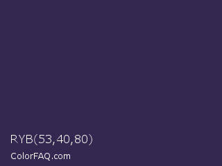 RYB 53,40,80 Color is a dark indigo color and the nearest color is Martinique #363050. Hex code #352850 and RGB value is rgb(53,40,80). In RGB color space, this color is composed of 21% red, 16% green, 31% blue, In CMYK color space, this color is composed of 34% cyan, 50% magenta, 0% yellow , 69% black , In HSL color space, this color has a hue angle of 260° , 33% saturation and 24% lightness.