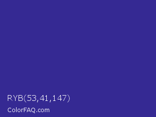 RYB 53,41,147 Color is a normal indigo color and the nearest color is Blue Pigment #333399. Hex code #352993 and RGB value is rgb(53,41,147). In RGB color space, this color is composed of 21% red, 16% green, 58% blue, In CMYK color space, this color is composed of 64% cyan, 72% magenta, 0% yellow , 42% black , In HSL color space, this color has a hue angle of 247° , 56% saturation and 37% lightness.