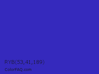 RYB 53,41,189 Color is a normal indigo color and the nearest color is Governor Bay #2f3cb3. Hex code #3529bd and RGB value is rgb(53,41,189). In RGB color space, this color is composed of 21% red, 16% green, 74% blue, In CMYK color space, this color is composed of 72% cyan, 78% magenta, 0% yellow , 26% black , In HSL color space, this color has a hue angle of 245° , 64% saturation and 45% lightness.