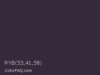 RYB 53,41,58 Color is a very dark purple color and the nearest color is Blackcurrant #32293a. Hex code #35293a and RGB value is rgb(53,41,58). In RGB color space, this color is composed of 21% red, 16% green, 23% blue, In CMYK color space, this color is composed of 9% cyan, 29% magenta, 0% yellow , 77% black , In HSL color space, this color has a hue angle of 282° , 17% saturation and 19% lightness.