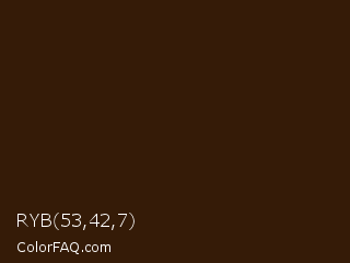 RYB 53,42,7 Color is a very dark orange color and the nearest color is Clinker #371d09. Hex code #351b07 and RGB value is rgb(53,27,7). In RGB color space, this color is composed of 21% red, 11% green, 3% blue, In CMYK color space, this color is composed of 0% cyan, 49% magenta, 87% yellow , 79% black , In HSL color space, this color has a hue angle of 26° , 77% saturation and 12% lightness.