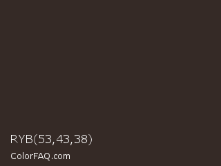 RYB 53,43,38 Color is a very dark orange color and the nearest color is Birch #373021. Hex code #352a26 and RGB value is rgb(53,42,38). In RGB color space, this color is composed of 21% red, 16% green, 15% blue, In CMYK color space, this color is composed of 0% cyan, 21% magenta, 28% yellow , 79% black , In HSL color space, this color has a hue angle of 16° , 16% saturation and 18% lightness.