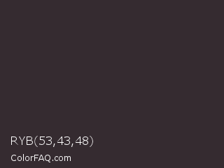 RYB 53,43,48 Color is a very dark rose color and the nearest color is Thunder #33292f. Hex code #352b30 and RGB value is rgb(53,43,48). In RGB color space, this color is composed of 21% red, 17% green, 19% blue, In CMYK color space, this color is composed of 0% cyan, 19% magenta, 9% yellow , 79% black , In HSL color space, this color has a hue angle of 330° , 10% saturation and 19% lightness.
