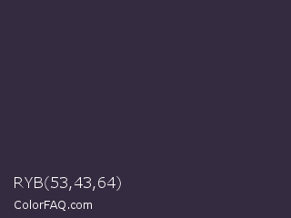 RYB 53,43,64 Color is a very dark violet color and the nearest color is Blackcurrant #32293a. Hex code #352b40 and RGB value is rgb(53,43,64). In RGB color space, this color is composed of 21% red, 17% green, 25% blue, In CMYK color space, this color is composed of 17% cyan, 33% magenta, 0% yellow , 75% black , In HSL color space, this color has a hue angle of 269° , 20% saturation and 21% lightness.