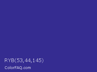 RYB 53,44,145 Color is a normal indigo color and the nearest color is Blue Pigment #333399. Hex code #352c91 and RGB value is rgb(53,44,145). In RGB color space, this color is composed of 21% red, 17% green, 57% blue, In CMYK color space, this color is composed of 63% cyan, 70% magenta, 0% yellow , 43% black , In HSL color space, this color has a hue angle of 245° , 53% saturation and 37% lightness.
