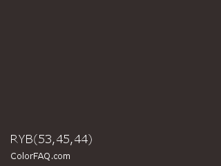 RYB 53,45,44 Color is a very dark red color and the nearest color is Thunder #33292f. Hex code #352d2c and RGB value is rgb(53,45,44). In RGB color space, this color is composed of 21% red, 18% green, 17% blue, In CMYK color space, this color is composed of 0% cyan, 15% magenta, 17% yellow , 79% black , In HSL color space, this color has a hue angle of 7° , 9% saturation and 19% lightness.