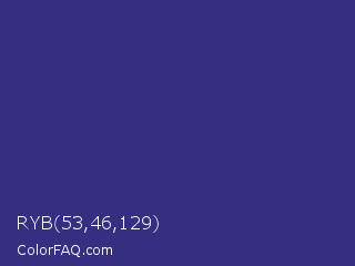 RYB 53,46,129 Color is a normal indigo color and the nearest color is Cosmic Cobalt #2e2d88. Hex code #352e81 and RGB value is rgb(53,46,129). In RGB color space, this color is composed of 21% red, 18% green, 51% blue, In CMYK color space, this color is composed of 59% cyan, 64% magenta, 0% yellow , 49% black , In HSL color space, this color has a hue angle of 245° , 47% saturation and 34% lightness.