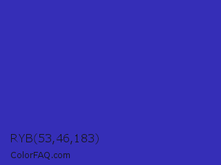 RYB 53,46,183 Color is a normal indigo color and the nearest color is Governor Bay #2f3cb3. Hex code #352eb7 and RGB value is rgb(53,46,183). In RGB color space, this color is composed of 21% red, 18% green, 72% blue, In CMYK color space, this color is composed of 71% cyan, 75% magenta, 0% yellow , 28% black , In HSL color space, this color has a hue angle of 243° , 60% saturation and 45% lightness.