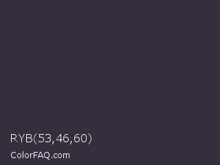 RYB 53,46,60 Color is a very dark violet color and the nearest color is Blackcurrant #32293a. Hex code #352e3c and RGB value is rgb(53,46,60). In RGB color space, this color is composed of 21% red, 18% green, 24% blue, In CMYK color space, this color is composed of 12% cyan, 23% magenta, 0% yellow , 76% black , In HSL color space, this color has a hue angle of 270° , 13% saturation and 21% lightness.