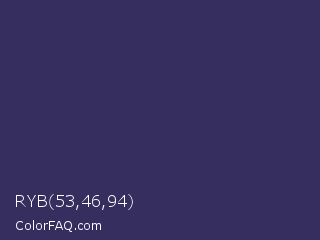 RYB 53,46,94 Color is a dark indigo color and the nearest color is Deep Koamaru #333366. Hex code #352e5e and RGB value is rgb(53,46,94). In RGB color space, this color is composed of 21% red, 18% green, 37% blue, In CMYK color space, this color is composed of 44% cyan, 51% magenta, 0% yellow , 63% black , In HSL color space, this color has a hue angle of 249° , 34% saturation and 27% lightness.