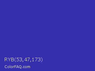 RYB 53,47,173 Color is a normal indigo color and the nearest color is Governor Bay #2f3cb3. Hex code #352fad and RGB value is rgb(53,47,173). In RGB color space, this color is composed of 21% red, 18% green, 68% blue, In CMYK color space, this color is composed of 69% cyan, 73% magenta, 0% yellow , 32% black , In HSL color space, this color has a hue angle of 243° , 57% saturation and 43% lightness.
