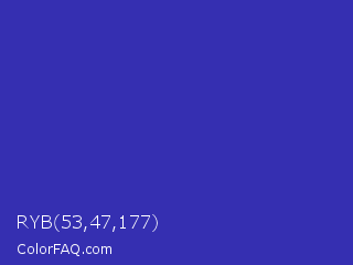 RYB 53,47,177 Color is a normal indigo color and the nearest color is Governor Bay #2f3cb3. Hex code #352fb1 and RGB value is rgb(53,47,177). In RGB color space, this color is composed of 21% red, 18% green, 69% blue, In CMYK color space, this color is composed of 70% cyan, 73% magenta, 0% yellow , 31% black , In HSL color space, this color has a hue angle of 243° , 58% saturation and 44% lightness.