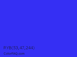 RYB 53,47,244 Color is a normal indigo color and the nearest color is Palatinate Blue #273be2. Hex code #352ff4 and RGB value is rgb(53,47,244). In RGB color space, this color is composed of 21% red, 18% green, 96% blue, In CMYK color space, this color is composed of 78% cyan, 81% magenta, 0% yellow , 4% black , In HSL color space, this color has a hue angle of 242° , 90% saturation and 57% lightness.