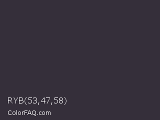 RYB 53,47,58 Color is a very dark purple color and the nearest color is Blackcurrant #32293a. Hex code #352f3a and RGB value is rgb(53,47,58). In RGB color space, this color is composed of 21% red, 18% green, 23% blue, In CMYK color space, this color is composed of 9% cyan, 19% magenta, 0% yellow , 77% black , In HSL color space, this color has a hue angle of 273° , 10% saturation and 21% lightness.