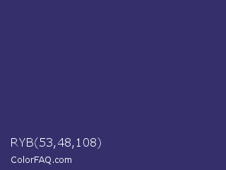 RYB 53,48,108 Color is a normal indigo color and the nearest color is Deep Koamaru #333366. Hex code #35306c and RGB value is rgb(53,48,108). In RGB color space, this color is composed of 21% red, 19% green, 42% blue, In CMYK color space, this color is composed of 51% cyan, 56% magenta, 0% yellow , 58% black , In HSL color space, this color has a hue angle of 245° , 38% saturation and 31% lightness.