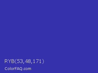 RYB 53,48,171 Color is a normal indigo color and the nearest color is Governor Bay #2f3cb3. Hex code #3530ab and RGB value is rgb(53,48,171). In RGB color space, this color is composed of 21% red, 19% green, 67% blue, In CMYK color space, this color is composed of 69% cyan, 72% magenta, 0% yellow , 33% black , In HSL color space, this color has a hue angle of 242° , 56% saturation and 43% lightness.