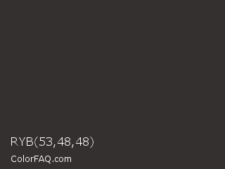 RYB 53,48,48 Color is a very dark red color and the nearest color is Mine Shaft #323232. Hex code #353030 and RGB value is rgb(53,48,48). In RGB color space, this color is composed of 21% red, 19% green, 19% blue, In CMYK color space, this color is composed of 0% cyan, 9% magenta, 9% yellow , 79% black , In HSL color space, this color has a hue angle of 0° , 5% saturation and 20% lightness.