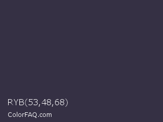 RYB 53,48,68 Color is a dark indigo color and the nearest color is Tuna #353542. Hex code #353044 and RGB value is rgb(53,48,68). In RGB color space, this color is composed of 21% red, 19% green, 27% blue, In CMYK color space, this color is composed of 22% cyan, 29% magenta, 0% yellow , 73% black , In HSL color space, this color has a hue angle of 255° , 17% saturation and 23% lightness.