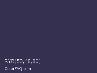 RYB 53,48,80 Color is a dark indigo color and the nearest color is Martinique #363050. Hex code #353050 and RGB value is rgb(53,48,80). In RGB color space, this color is composed of 21% red, 19% green, 31% blue, In CMYK color space, this color is composed of 34% cyan, 40% magenta, 0% yellow , 69% black , In HSL color space, this color has a hue angle of 249° , 25% saturation and 25% lightness.