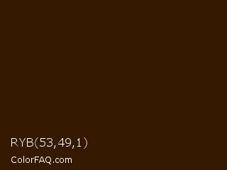 RYB 53,49,1 Color is a very dark orange color and the nearest color is Jacko Bean #2e1905. Hex code #351a01 and RGB value is rgb(53,26,1). In RGB color space, this color is composed of 21% red, 10% green, 0% blue, In CMYK color space, this color is composed of 0% cyan, 51% magenta, 98% yellow , 79% black , In HSL color space, this color has a hue angle of 29° , 96% saturation and 11% lightness.