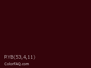 RYB 53,4,11 Color is a very dark red color and the nearest color is Temptress #3b000b. Hex code #35040b and RGB value is rgb(53,4,11). In RGB color space, this color is composed of 21% red, 2% green, 4% blue, In CMYK color space, this color is composed of 0% cyan, 92% magenta, 79% yellow , 79% black , In HSL color space, this color has a hue angle of 351° , 86% saturation and 11% lightness.