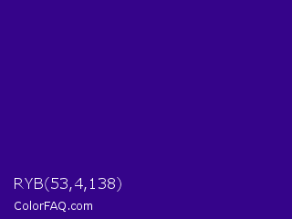 RYB 53,4,138 Color is a dark violet color and the nearest color is Kingfisher Daisy #3e0480. Hex code #35048a and RGB value is rgb(53,4,138). In RGB color space, this color is composed of 21% red, 2% green, 54% blue, In CMYK color space, this color is composed of 62% cyan, 97% magenta, 0% yellow , 46% black , In HSL color space, this color has a hue angle of 262° , 94% saturation and 28% lightness.