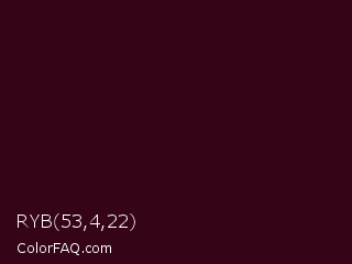 RYB 53,4,22 Color is a very dark rose color and the nearest color is Aubergine #3b0910. Hex code #350416 and RGB value is rgb(53,4,22). In RGB color space, this color is composed of 21% red, 2% green, 9% blue, In CMYK color space, this color is composed of 0% cyan, 92% magenta, 58% yellow , 79% black , In HSL color space, this color has a hue angle of 338° , 86% saturation and 11% lightness.