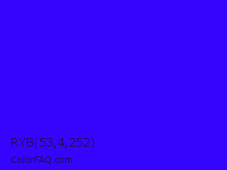 RYB 53,4,252 Color is a normal indigo color and the nearest color is Electric Ultramarine #3f00ff. Hex code #3504fc and RGB value is rgb(53,4,252). In RGB color space, this color is composed of 21% red, 2% green, 99% blue, In CMYK color space, this color is composed of 79% cyan, 98% magenta, 0% yellow , 1% black , In HSL color space, this color has a hue angle of 252° , 98% saturation and 50% lightness.