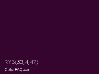 RYB 53,4,47 Color is a very dark magenta color and the nearest color is Melanzane #300529. Hex code #35042f and RGB value is rgb(53,4,47). In RGB color space, this color is composed of 21% red, 2% green, 18% blue, In CMYK color space, this color is composed of 0% cyan, 92% magenta, 11% yellow , 79% black , In HSL color space, this color has a hue angle of 307° , 86% saturation and 11% lightness.