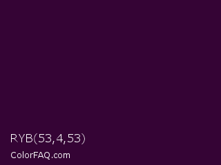 RYB 53,4,53 Color is a very dark magenta color and the nearest color is Mardi Gras #350036. Hex code #350435 and RGB value is rgb(53,4,53). In RGB color space, this color is composed of 21% red, 2% green, 21% blue, In CMYK color space, this color is composed of 0% cyan, 92% magenta, 0% yellow , 79% black , In HSL color space, this color has a hue angle of 300° , 86% saturation and 11% lightness.