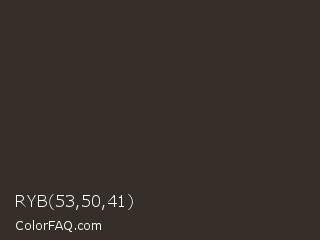 RYB 53,50,41 Color is a very dark orange color and the nearest color is Thunder #33292f. Hex code #352e29 and RGB value is rgb(53,46,41). In RGB color space, this color is composed of 21% red, 18% green, 16% blue, In CMYK color space, this color is composed of 0% cyan, 13% magenta, 23% yellow , 79% black , In HSL color space, this color has a hue angle of 25° , 13% saturation and 18% lightness.